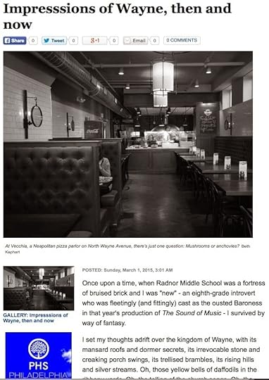 In this weekend's Philadelphia Inquirer, I'm writing about the place that has been close to my heart ever since that eighth-grade move, the town of Wayne, PA, which has beguiled me, supported me, and, of late, returned old friends to me.