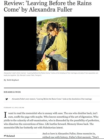 The thing is, I could have written a book about this book. I'd have dedicated a long chapter, at least, to a comparison, side by side, of three particular present-tense scenes in Fuller's first memoir played out against those same three scenes, now recorded with the reflective and rearranging past-tense of this new third memoir, Leaving Before the Rains Come.