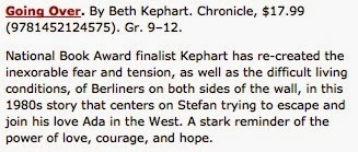 Going Over is a teen novel of far bigger ideas than most I have come across. The setting is brilliant and the split narrative, between Ada and Stefan, provides readers with a close look at just how different Berlin became after the split. (Which also makes the reunification that much more impressive.) There are so many novels set during WWII, while the Cold War remains stubbornly overlooked. I'm thus delighted with what Kephart has done here and find these characters, in their decidedly European setting, to be different in the best way. It's a thought provoking title with exceedingly likeable characters and a great ending; all of which make Going Over a winner.