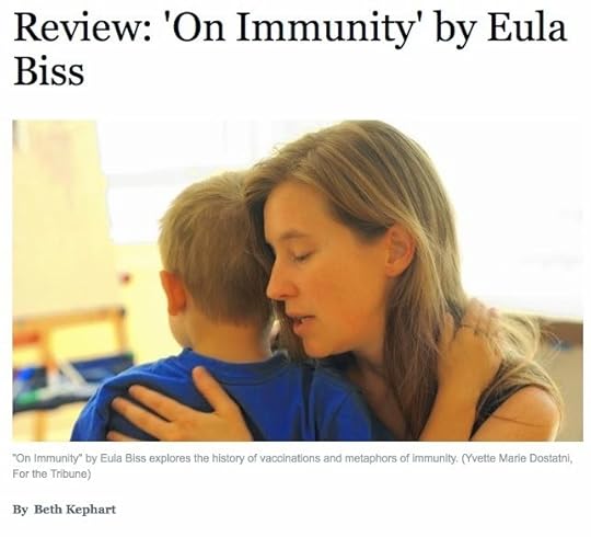 You read Eula Biss' new book slowly, with care. You are not sure, at first, where it is going. The topic is immunity, also inoculation, also vaccination, epidemics, social responsibility, vampirism and the impossibility of completely knowing. There are episodes of bright, emboldened insight. There are incidents — sometimes still and sometimes cinematic — of personal story. There are playground questions and interviews with scientists, Achilles and Dracula, myths and birth and a child sleeping. There are others, and there is us. There are the invisible airborne germs and the visible, struck down dying.