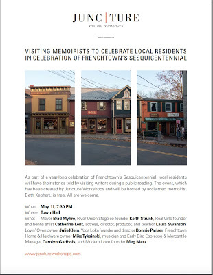 And if you happen to be in Frenchtown, NJ, next Thursday evening, join us for the Frenchtown Empathy Project. Kelly Simmons will be in the house. Keith Strunk will, through our writers, on the stage. And all of those who have joined us for this memoir week will be sharing their words for the people of Frenchtown, who are so graciously hosting Juncture.