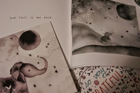 Yesterday, as a cadre of painters and window caulkers and windowsill fixers and stucco men finished the rescue of my modest bungalow home, a gift arrived from Meera, a package of most precious things. Number 37 of 50 of her keepsake Elephant and Moon (her illustrated story of an elephant seeking his place in the world). A handmade card: Grateful. A postcard. Her long-lettered words to me. She is so utterly embrace-able, this Meera Lee. And I am enormously lucky to have her in my life.