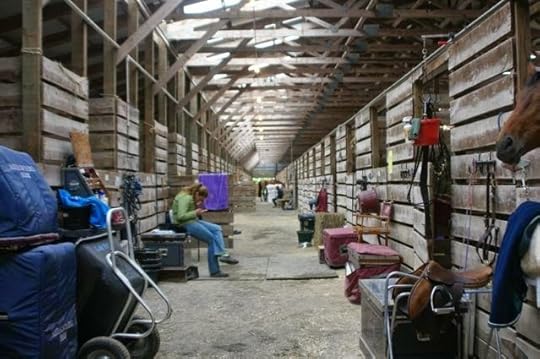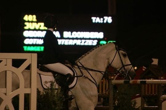 Last night was the Grand Prix. Leading up to all of that was this—anticipation in the stables, an entertaining cowboy, Clydesdales on the grounds. The first jumper of the night was Georgina Bloomberg.