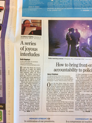 Today my creative nonfiction students at the University of Pennsylvania shifted my mood, as they do. Their tough-tender souls, their velocity of ideas, their endearing capacity for listening, their well-wrought, thoroughly considered words. Their nouns and verbs outpacing their adjectives and adverbs. Their piano melodies. These young people respect the work and one another; that's transparent. They put their souls into their words; I cheer them on. They do unexpected things elaborately well without ever getting precious in the process.