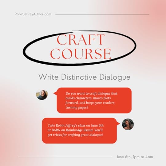 Join me on June 6th, 2024 from 1pm to 4pm live and in person at the BARN Makerspace on Bainbridge Island to learn to craft dialogue that builds characters, moves plots forward, and keeps your readers turning pages.