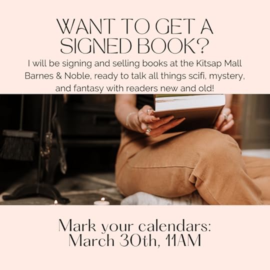 In less than a week, I’ll be back at it again — this time at the Kitsap Mall Barnes & Noble! March 30th starting at 11am I will be in the store signing and selling copies of all my books, ready to meet and greet, chat about all things bookish, and see all your lovely faces. Be sure to mark your calendars so you can stop by and say hi!