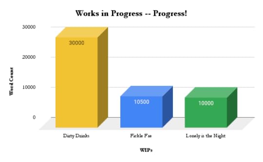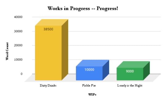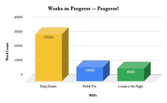 Dirty Drinks – I’ve refocused my writing efforts over the last week to put all my energy into Dirty Drinks. My self-imposed deadline for getting this piece to my editor is rapidly approaching (about 12 days!) and I’d really love to meet it! I think I’ll get there, the story is really close to wrapping up. Just two major action scenes left, and some connective tissue to create and then it’ll be complete! Fickle Fae – Still working on making the shift to first person for this piece, but I think it was absolutely the right choice. The new bits I am writing are coming out much more smoothly since I made the switch. It’s cost me some words (as you can see comparing this week’s to last) but it’s worth it. Lonely is the Night – As I mentioned above in Dirty Drinks, I’ve put this project on very temporary hold as I focus on getting DD finished for my editor to take a look at. But fear not! I shall be back to work on it soon.In brief, the writing has been going well. I’ve been very proud of the progress I’ve been making on Dirty Drinks and am so excited to be close to finishing it. But I can’t let myself get complacent in this final stretch – I’ve still got to bring my A-game and write as well as I can!