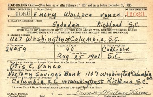 Last night, I was moving files to ThePhototStick. I have so many files that I might be until January 1st. Anyway, I was looking at U.S., World War II Draft Cards Young Men, 1940-1947 on Ancestry.com. Previously, I had found Emory Wallace Vance's WWII Draft Card, and I had put on my computer without the source: