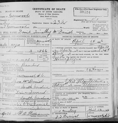 Death certificate for Rev. MacDaniel: