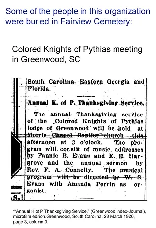 Some parts of Fairview Cemetery were divided into cemetery lots by Wah and sold. These deeds are on file and indexed at the Greenwood County Clerk of Court. One such family plot (Percival) is clearly visible on the front right side of the cemetery. Undertaker, James T. Percival (1882-1937) and son, Dr. Theo. Percival are interred at Fairview.
