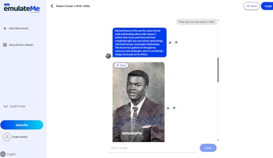 https://video.wixstatic.com/video/3176fe_8193292a23c249be8b362d384609ecc4/144p/mp4/file.mp4I love EmulateMe because I can have my grandchildren chat with my father. It is the best emulation of him. In my Genealogy! Just Ask! Facebook Group, you can get 10% off. Try it today! Let me know what you think, and if you have any doubts, just ask me: robinfoster@genealogyjustask.com
