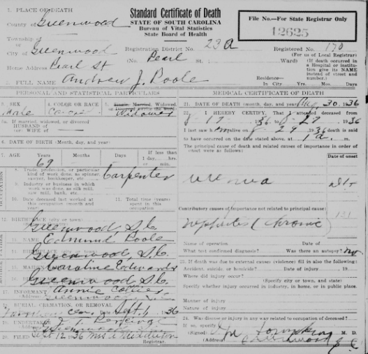 image 354 of 1703; citing Department of Archives and History, State Records Center, Columbia." alt=""South Carolina Deaths, 1915-1943," index and images, FamilySearch (https://familysearch.org/pal:/MM9.3.1... : accessed 15 Jul 2014), 004179134 > image 354 of 1703; citing Department of Archives and History, State Records Center, Columbia.">His name was Andrew J. Poole, and his parents were Edmund Poole and Caroline Edwards Poole. He was buried with his mother. We still need to find Edmund or Edmond Poole.