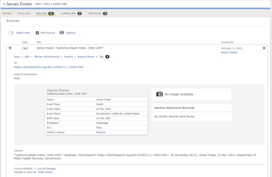 It was the first record, a death index for James Foster who died 23 March 1962. I had his obituary, but not a death index. I immediately added it to the Family Tree which created a Source: