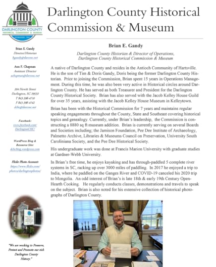 I am a member of the South Carolina Genealogical Society - Columbia Chapter. I am a member of Anson County Historical Society, in Wadesboro, North Carolina (www.ansonhistoricalsociety.org). On February 28, 2015, and 2018, and February 2021, I presented at the Wisconsin Black Historical Society. I served as a volunteer at the Lawrence Local History and Genealogy Room of the Greenwood County Library, and the Greenwood, SC Family History Center director.