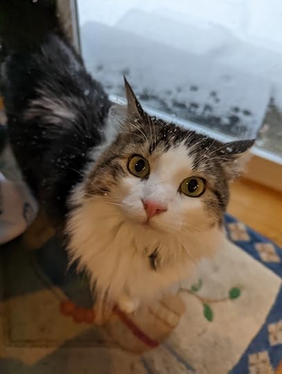 Snow on Christmas day is rare in the Puget Sound area. We’re more likely to see it in January or February, but there was some falling yesterday and has collected a fair amount as of this morning. We opened the back door for the cats. They are both indoor cats, but they find padding around in the snow intriguing. By “padding around in the snow,” I mean that if we carry them out they might slowly move about, and when we open the door they cautiously creep around on the first step. Either way, they are cats, with snow on their fur, so they are adorable.