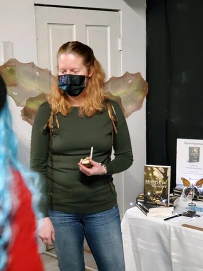 Books: The general information I found was 50-100 of each book for one (day) event. This was a smaller event, and I am still unknown. I brought 50 and did not come close to selling out. Signage: Big, eyecatching, genre-specific. I got an 11×17 foam board of an image I created using my cover art and review quotes. It worked well for the space given to me. I might add a cloth banner to go on the table cloth and hang down in front. I will add a picture of me to the foam board when I upgrade to a larger version. Many people were surprised I was the author…which surprised me, so lesson learned. Giveaways: have some, and have something that includes your author info on it. Fairy wings are my logo, so I had butterfly stickers for the kids and some simple bookmarks with a cover image on one side and my logo and info on the back with a QR code for my ebook link. The wax seals were also a draw. I sold those 2 for $1 and gave one for free with each book sale. They are more supply- and labor-intensive, so I decided not to give them away for free. Booth buddy/transportation: recommend having a booth buddy and hand cart if possible. Books are heavy, so are tables and chairs and all the other stuff you will bring. I borrowed my dad’s collapsable hand cart.My husband came with me as my buddy. He is better with people than I am, so he helped me get started with the whole “interaction” thing. He also covered for breaks and completed purchases while I signed the books. My niece also came as my cashier. Taking notes on my sales and helping make change. She stuck out the entire four hours too!
