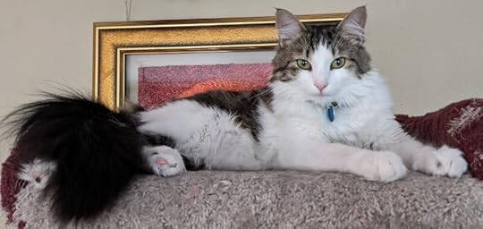 Little Cat is now officially out of the kitten phase. She is still high energy, but she has taken to more lap-sitting over the last month or so in the evenings. Big Cat has no problem with her using him as a full-body pillow—after all, she can serve as a heated blanket for him—but he grumps at her when she starts grooming him while he tries to get his 23.5 hours of sleep a day.