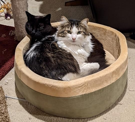Fortunately, temperatures rose overnight, and the two inches of ice coating every surface melted away. We are back to pouring rain in time for driving to events tonight and tomorrow. If you are one of the many people who had flights canceled due to the dangerous weather, I hope you can still make the best of the holiday time remaining. To everyone, Merry Christmas, and I leave you with this picture of my cats snuggling in their heated cat bed.