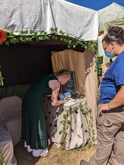 The faire initially sold out, so they opened more capacity for Saturday. Roads were clogged, and people waited for hours to get in. Everyone crowded into the grounds excited for their next fantastical adventure. As they passed by, my husband called out to lovers of fantasy books. Then, he and my sister would introduce them to my stories.