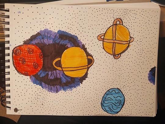 Artist: Aurian Millan (age 11)An enormous nebula, darkness radiating with blue and purple, served as the backdrop for an alien solar system. A red gas giant swirled with storm clouds, while its blue partner appeared to flow like an ocean. Two of the planets had rings. One of these had multiple sets of rings orbiting the planet on perpendicular planes.
