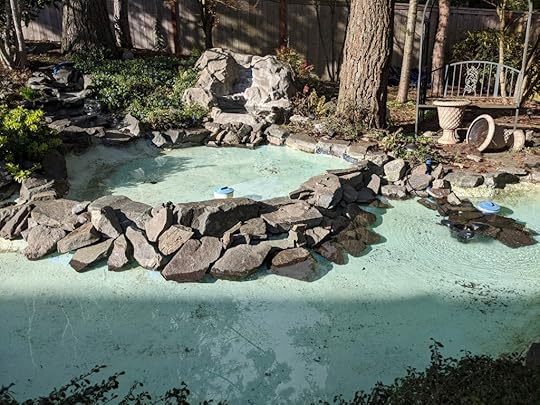 I say “we,” but all of this work was 99.9% him working over about eight hours. A few patches of pond armor are still needed, but it looks amazing. We have a skimmer and a new vacuum, so we are hoping we can keep it sparkling this year.