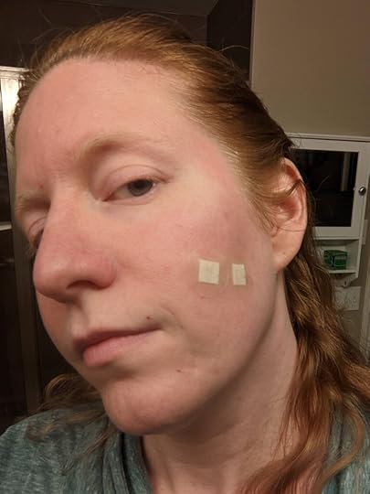Finally, she came loose. I had her scruff and bent to set her gently inside the doorway. The moment she saw her safety blanket through the opening, she decided to use my face as a springboard. Her back claws pierced my cheek and lip as she tore forward.