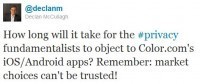 And because the app's default setting is to share every photo and video you snap openly with the world, Declan wonders "How long will it take for the #privacy fundamentalists to object to Color.com's iOS/Android apps?" After all, he says facetiously, "Remember: market choices can't be trusted!" He then reminds us that there's really nothing new under the privacy policy sun and tat we've seen this debate unfold before, such as when Google released it's GMail service to the world back in 2004.