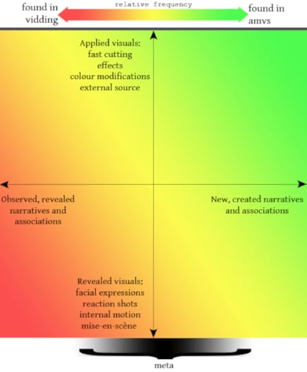 Vidding tends toward deep analysis of character and show and utilisation of interior movement where amvs tend toward meta, spectacle and genre works with a strong utilisation of external motion, footage, effects and original art.I've also vaguely plotted some well-known videos (though the amvs totally show my age) onto the graph. It's very rough but this should give an idea as to how I see the whole amv vs vidding spectrum.