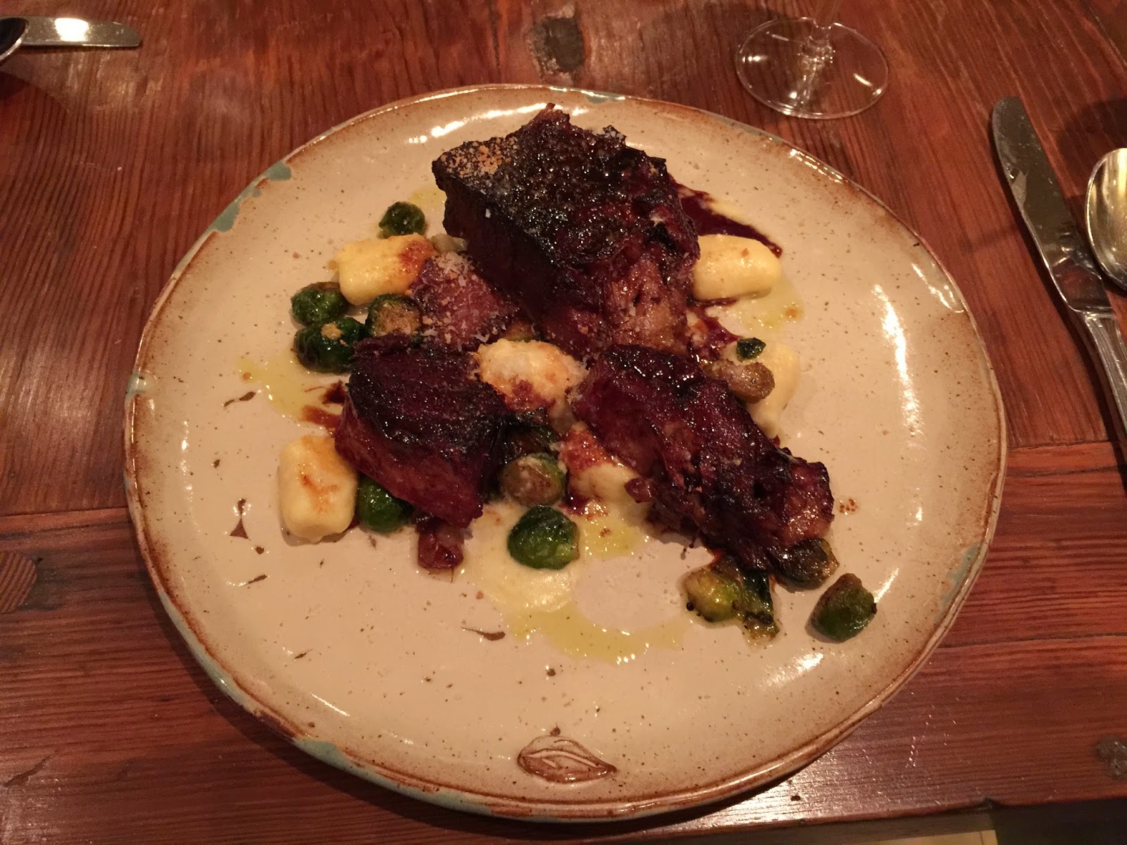 The portions here are never small and rarely light, but they are always delicious. Just check out my main dish tonight, a pork shoulder with polenta gnocchi.