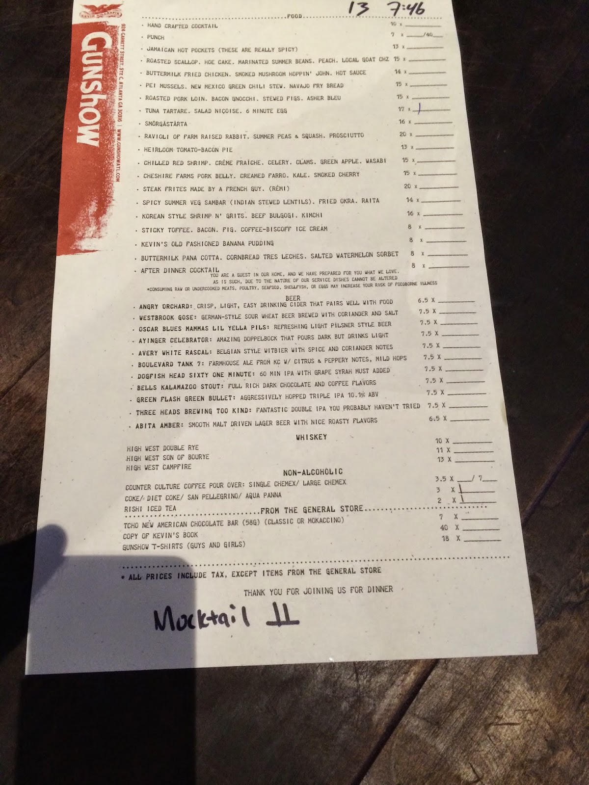 Click an image to see a larger version.You choose something, and the person who brought it to you adds hash marks to the menu. As you can see on the one above, at this point we had ordered four beverages and one dish, the incredibly delicious tuna tartare with egg.