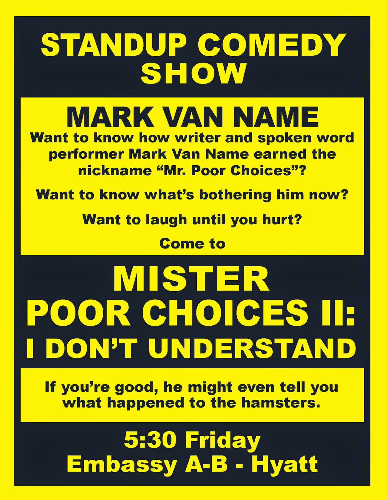 As I understand it, the room has plenty of seats, so I need plenty of people to fill them. Comedy works best with a good crowd, so you should come and help be a part of one.
