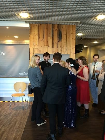 At the reception, two celebrities unexpectedly appeared: Peter Davidson and David Tennant. As things turned out, both must have come should their shows have won awards (neither did), so no one in the main audience saw them. All the people at the reception with whom I spoke were, however, a-twitter at their presence. All the women with whom I spoke agreed that Tennant was far hotter in person than on screen. I have to agree that he is entirely more beautiful in person than on screen.