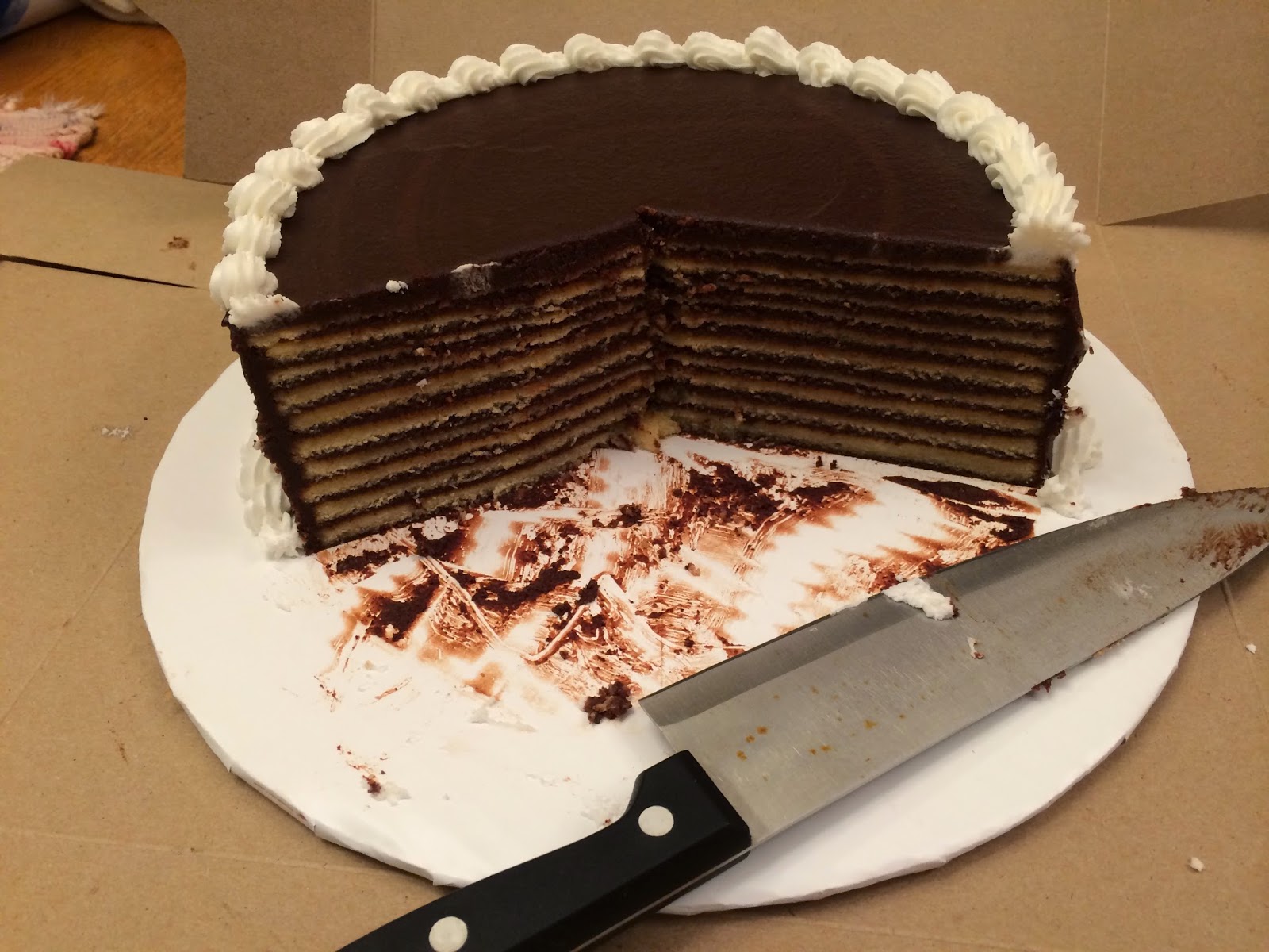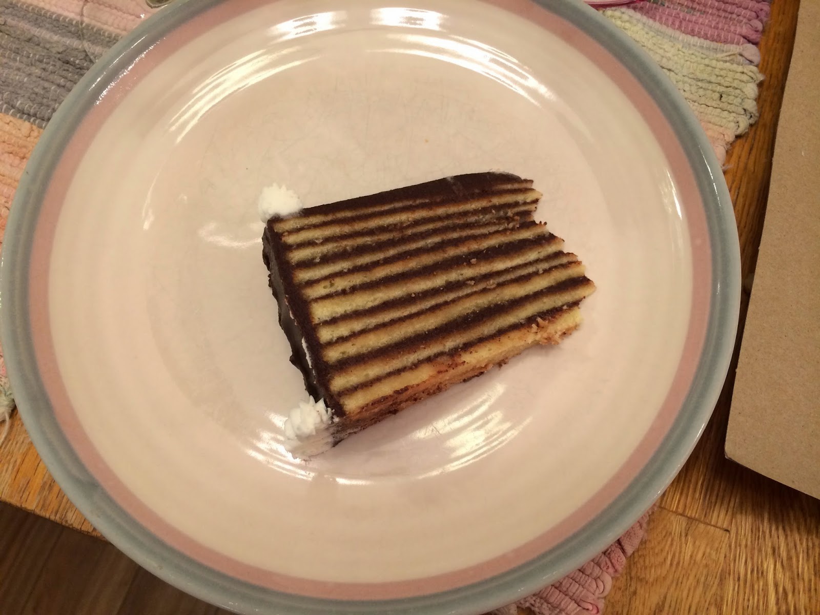 We learned a while ago from Bob and Rose, who are both from Maryland, that Maryland has a state dessert: the Smith Island Cake. We also discovered that Bob knew how to bake this eight- to fifteen-layer beauty. Armed with this knowledge, we had no choice but to order one from Bob.