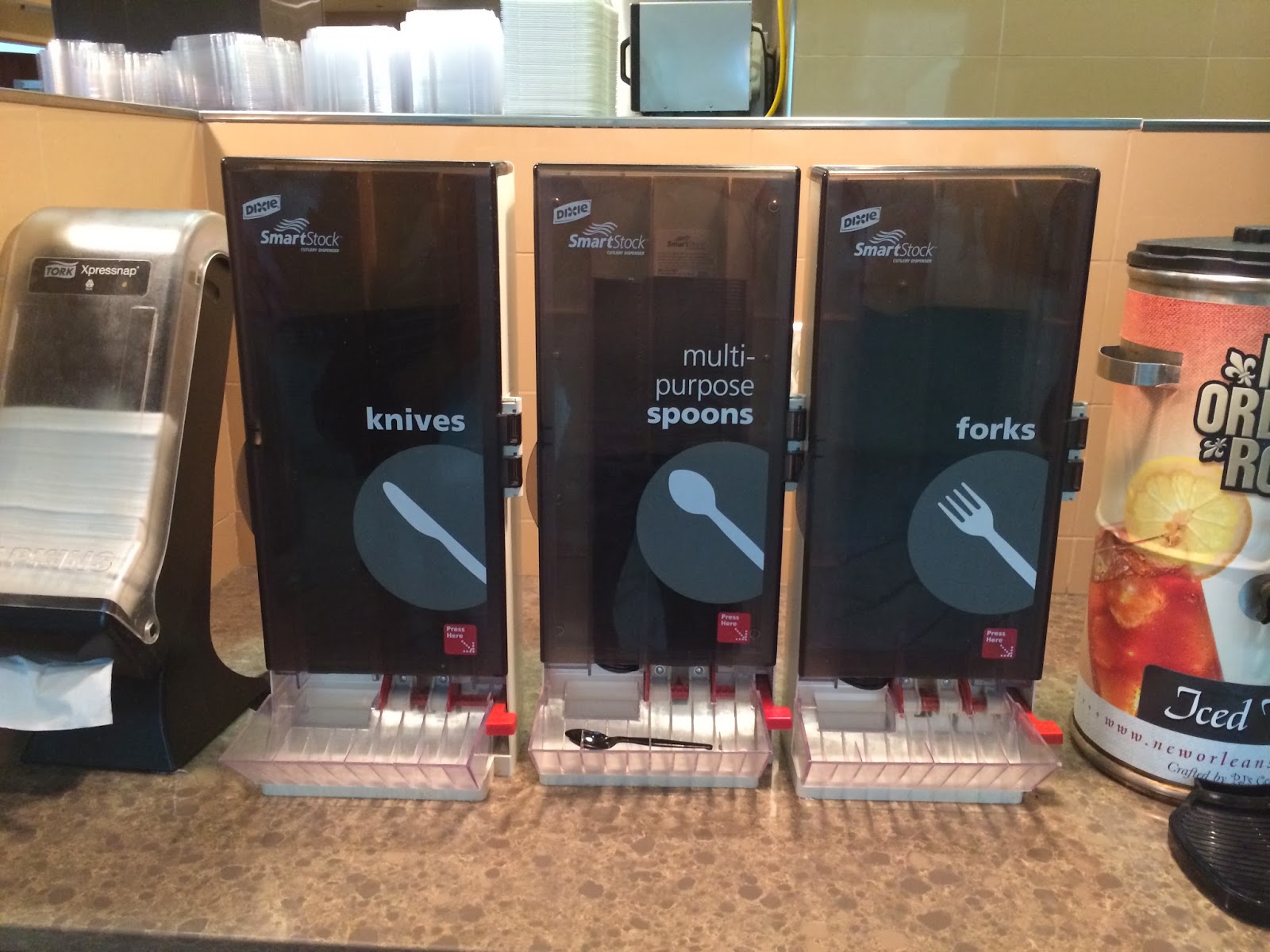 For example, on the way back from New Orleans on Monday, while grabbing lunch in MSY, I learned that spoons are definitively the most useful bit of cutlery, because they are multi-purpose. Don't take my word for this profound insight; check out the declaration from the fine folks at Dixie, whose SmartStock dispenser makes this point clear.