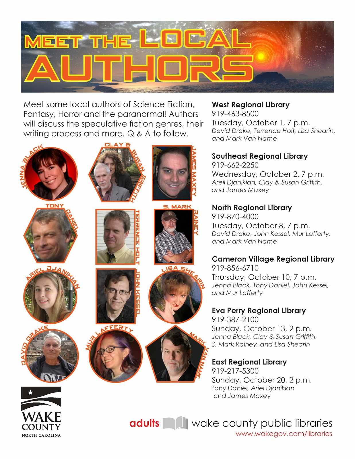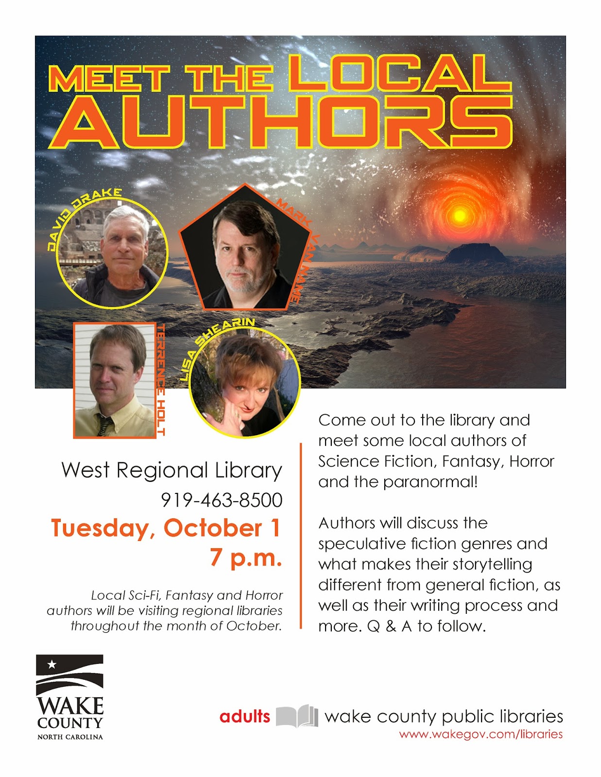The redoubtable Dan Brooks is once again spearheading an SF/Fantasy author series for the Wake County Public Libraries. Dan graciously invited me to take part in two of these events. The first, which is also the first of the series, is this coming Tuesday, October 1, at 7:00 p.m. at the Wake County West Regional Library.