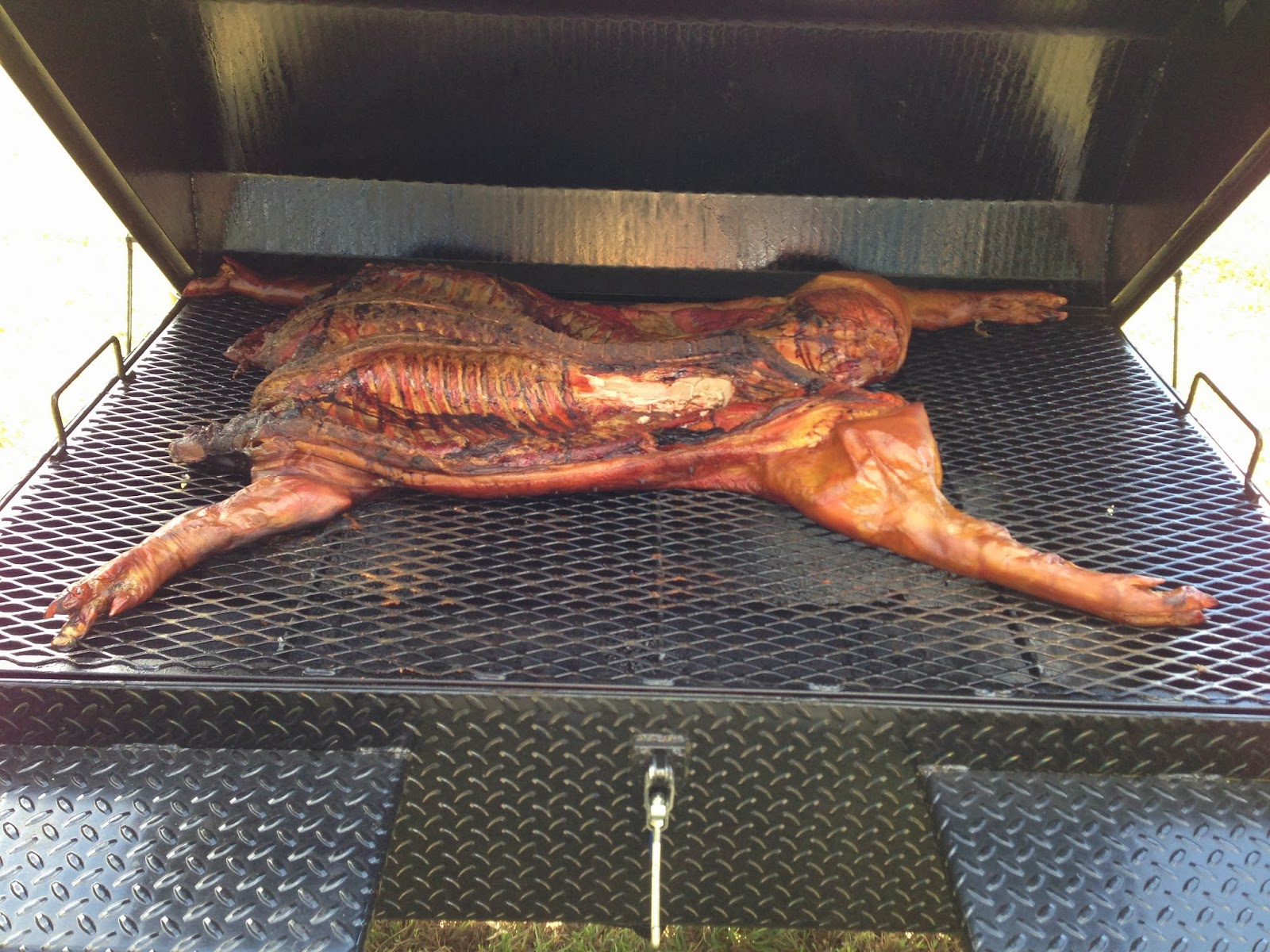 Today, in keeping with another of our annual traditions, something approaching a hundred of us gathered at Dave's to celebrate his birthday with his annual pig-picking, an event he has been holding since before I met him. We gather, chat, consume all sorts of foods that we bring, and chow down on the main attraction, a full pig.