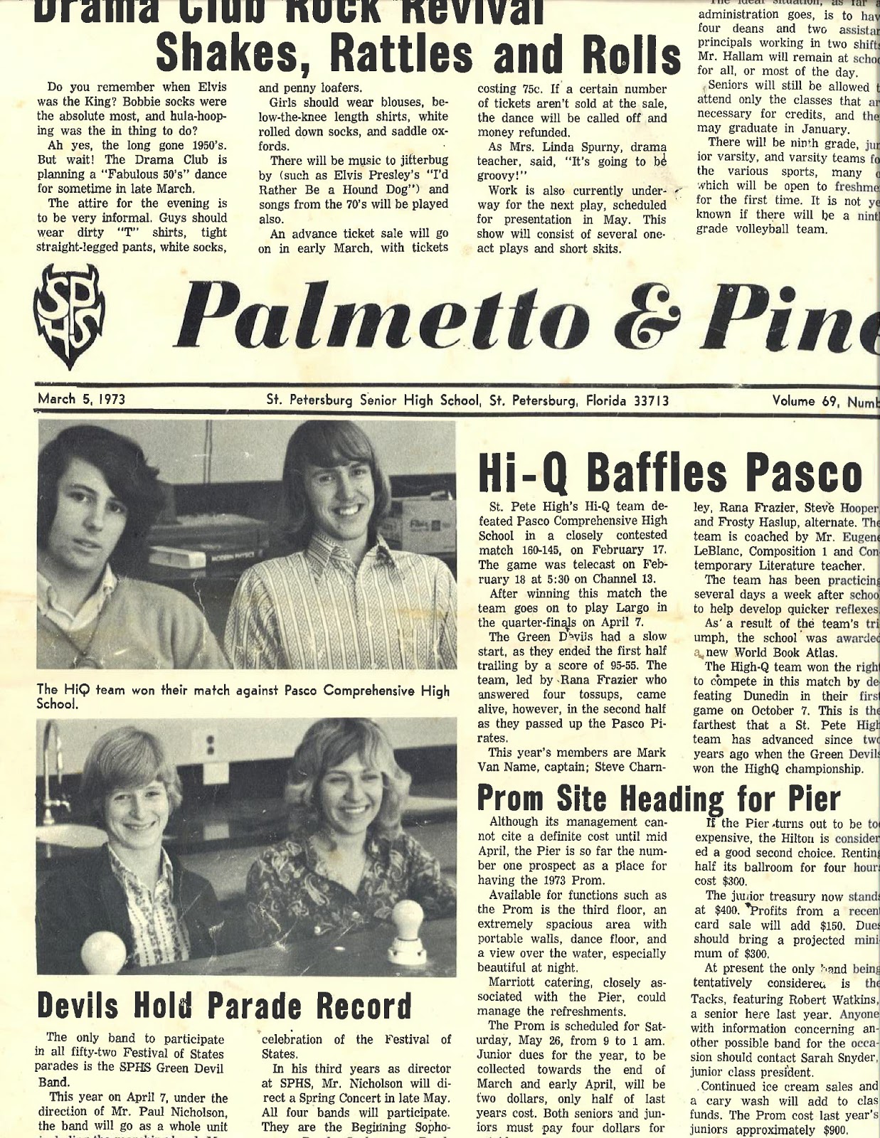 Click on the photo to see a larger image.Yes, I was on the school's Hi-Q team--not only on it, but captain of it. What of it, buddy? We were the comeback kids and undefeated heading into the semifinals, at which incorrect judging during a match televised live cost us that match. (The show runners later admitted the judge was wrong but said they could do nothing about it because the show had already aired. Not that I'm bitter about it or anything.)