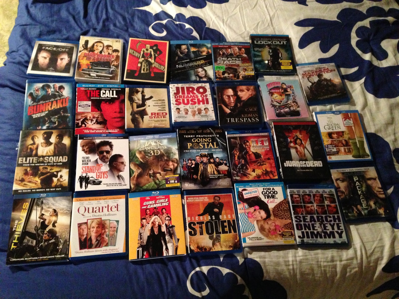 Long-time readers will recall that we watch a lot of movies at the beach, usually two a day. The early show is, in theory, a more accessible film, while the late show tends toward more violent, action-oriented flicks. This year, we crammed 27 films into the days at the beach. For those interested, here's a photo of the covers of all the DVDs.