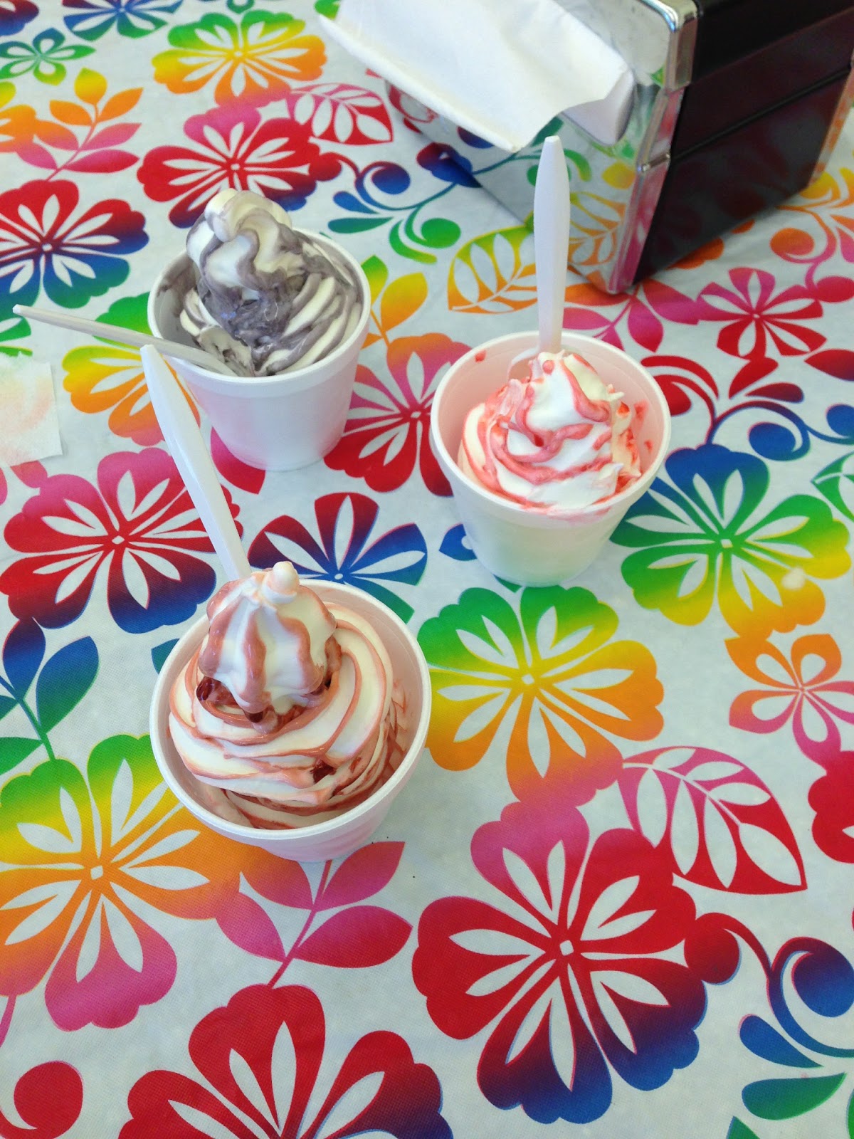 Today, three of us went for a somewhat different choice of flavors: blue goo, orange, and the oft-chosen strawberry.