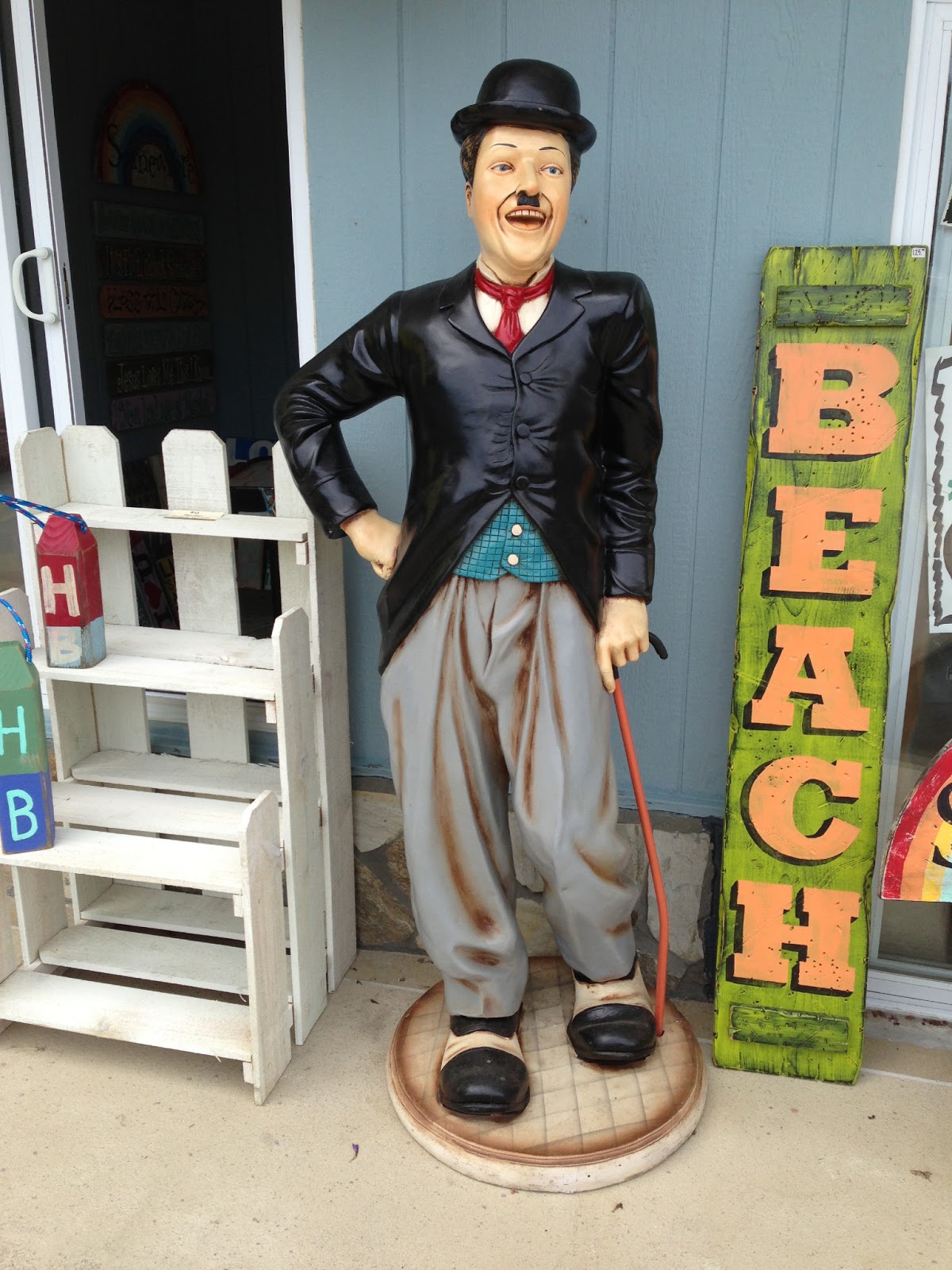 Prior to today's Squeezepedition, we spent some time examining the offerings of various beach thrift shops, an always interesting experience. At the front of one shop stood this roughly life-size Charlie Chaplin statue, easily the creepiest such thing I've seen in quite a while.