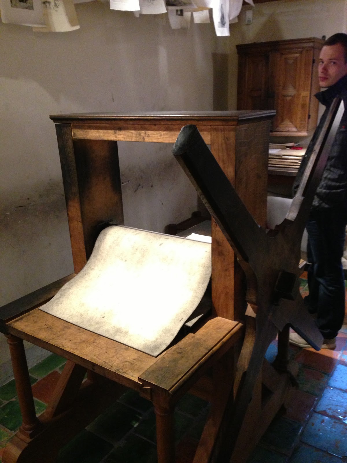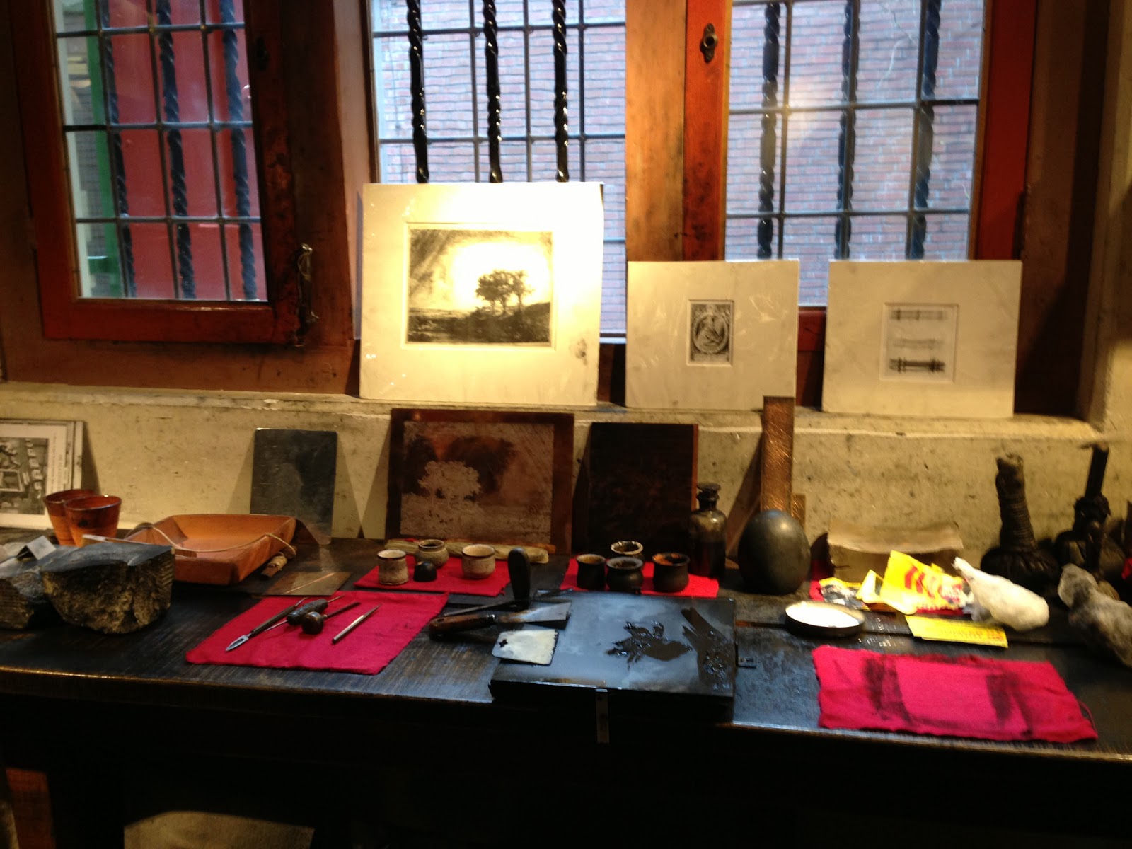 Rembrandt didn't just live and paint in this house; he also worked on his etchings and printed them, here. In a room off the anteroom, he had a press, a drying line, and a workbench.