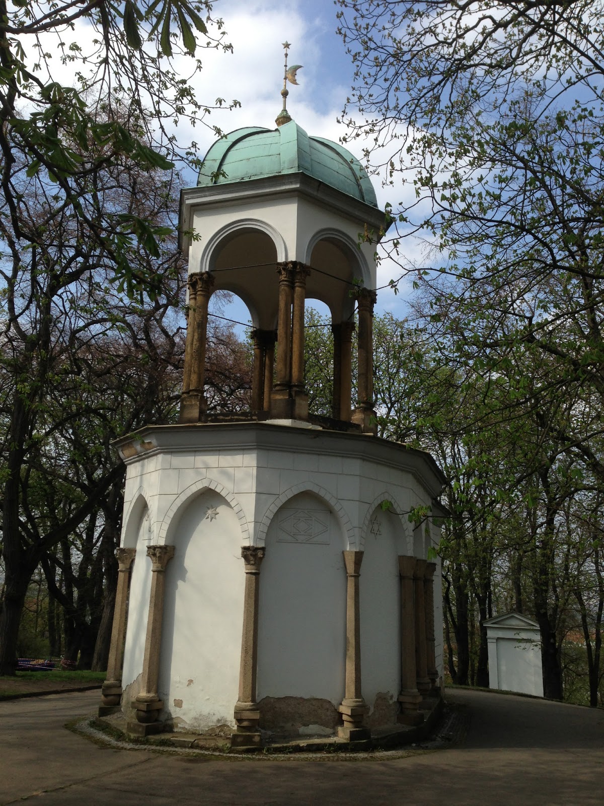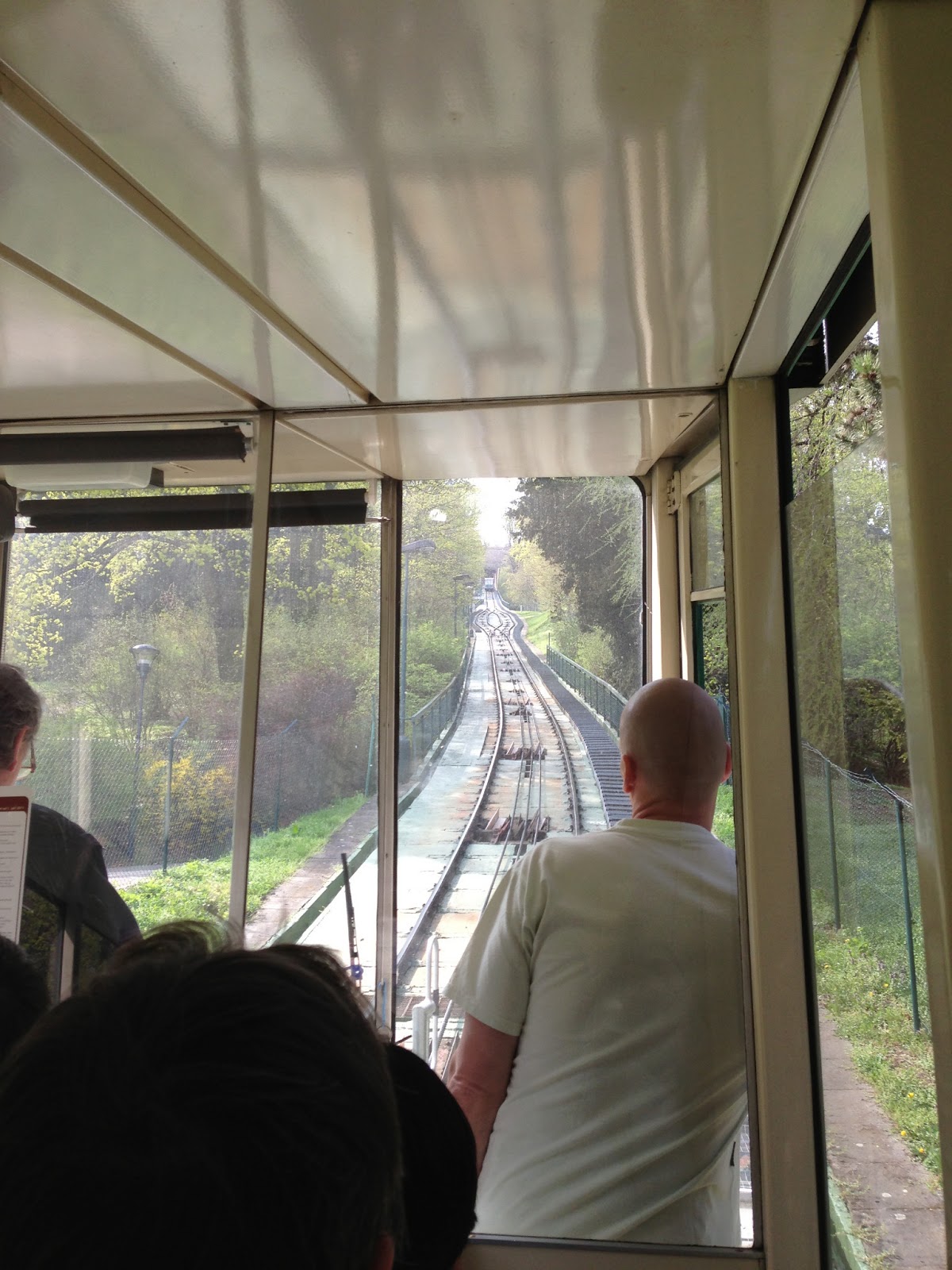 Though I've made it a practice this trip to walk everywhere I reasonably could, I could not resist the chance to ride a funicular up a hill to a cluster of buildings, a park, and Petrin Lookout Tower. The view from inside the funicular was just what you'd expect, but I still enjoyed the ride.