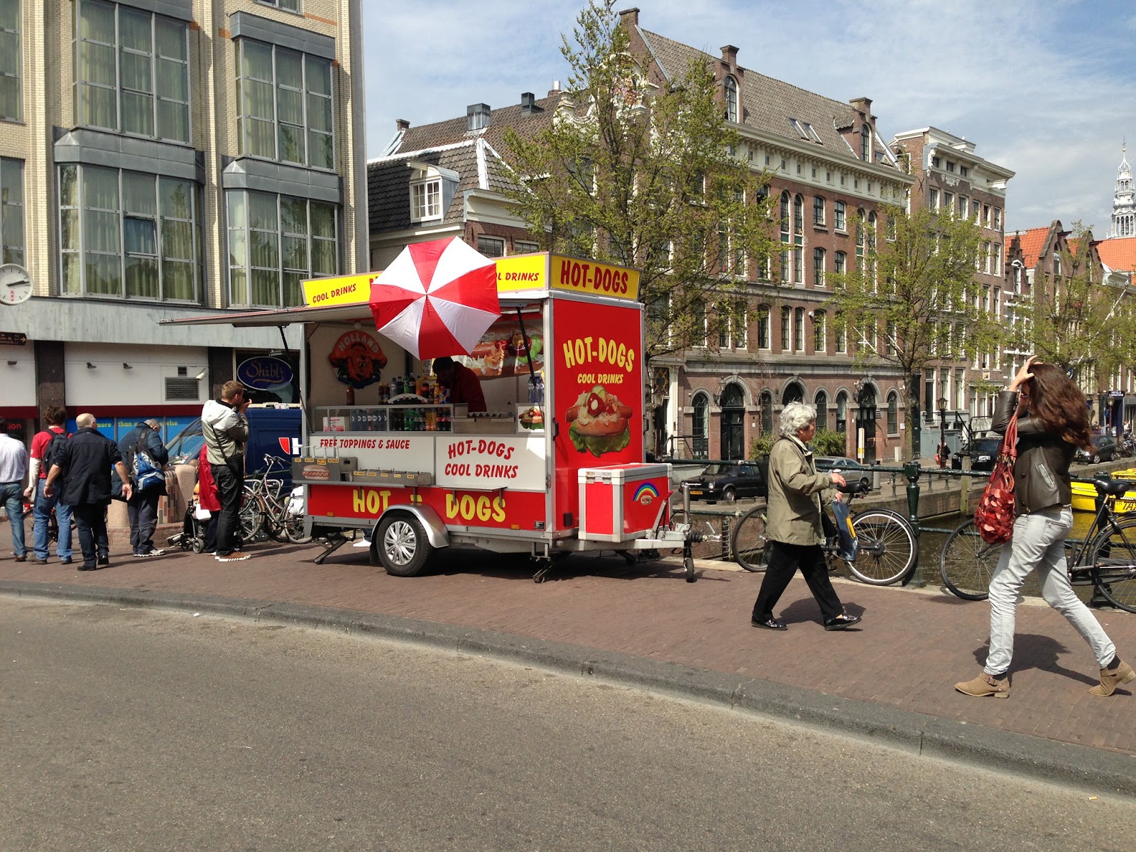 This city loves its hot dogs. Stands selling them are everywhere. On the canal bridge nearest the hotel, two vendors sit opposite one another in fierce competition.