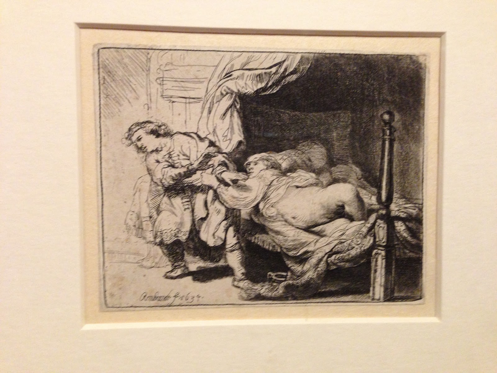 Getting to see both the etching and the original plate was also a treat, as in this duo about Potiphar's wife, who failed at seducing Joseph but kept his coat for later blackmail use.
