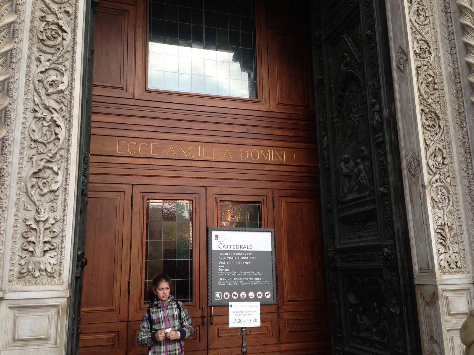 Closer to home, I had to stop by the Duomo for a last (for this trip, not forever, I hope!) visit. The left doors read, "Hail, full of grace".