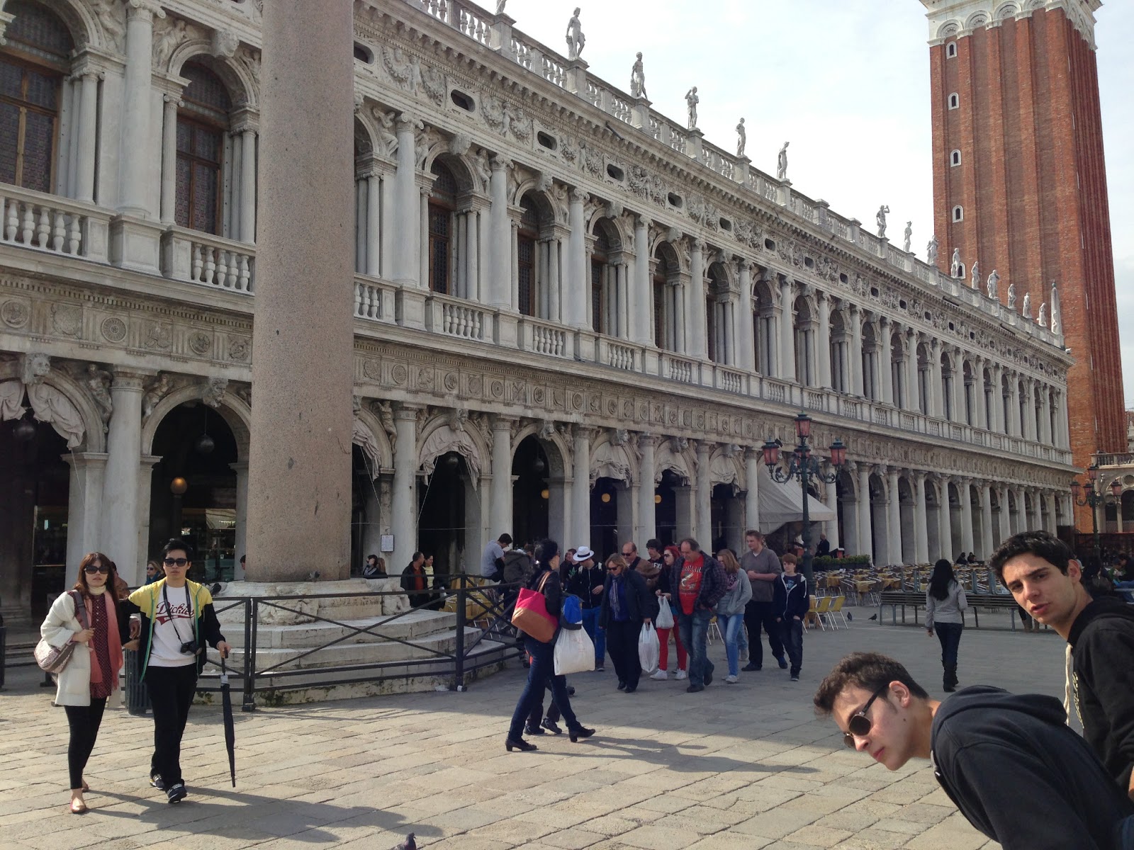 The Doge's palace was the seat of government, functionally equivalent to the de' Medici's Palazzo Vecchio and equally as intimidating, though in somewhat different ways. It's another do-not-miss Venetian attraction. The structure grew over hundreds of years into the enclosed fortress it is today. To give you a sense of the different types of construction, here's a shot from the entrance end of the interior courtyard.