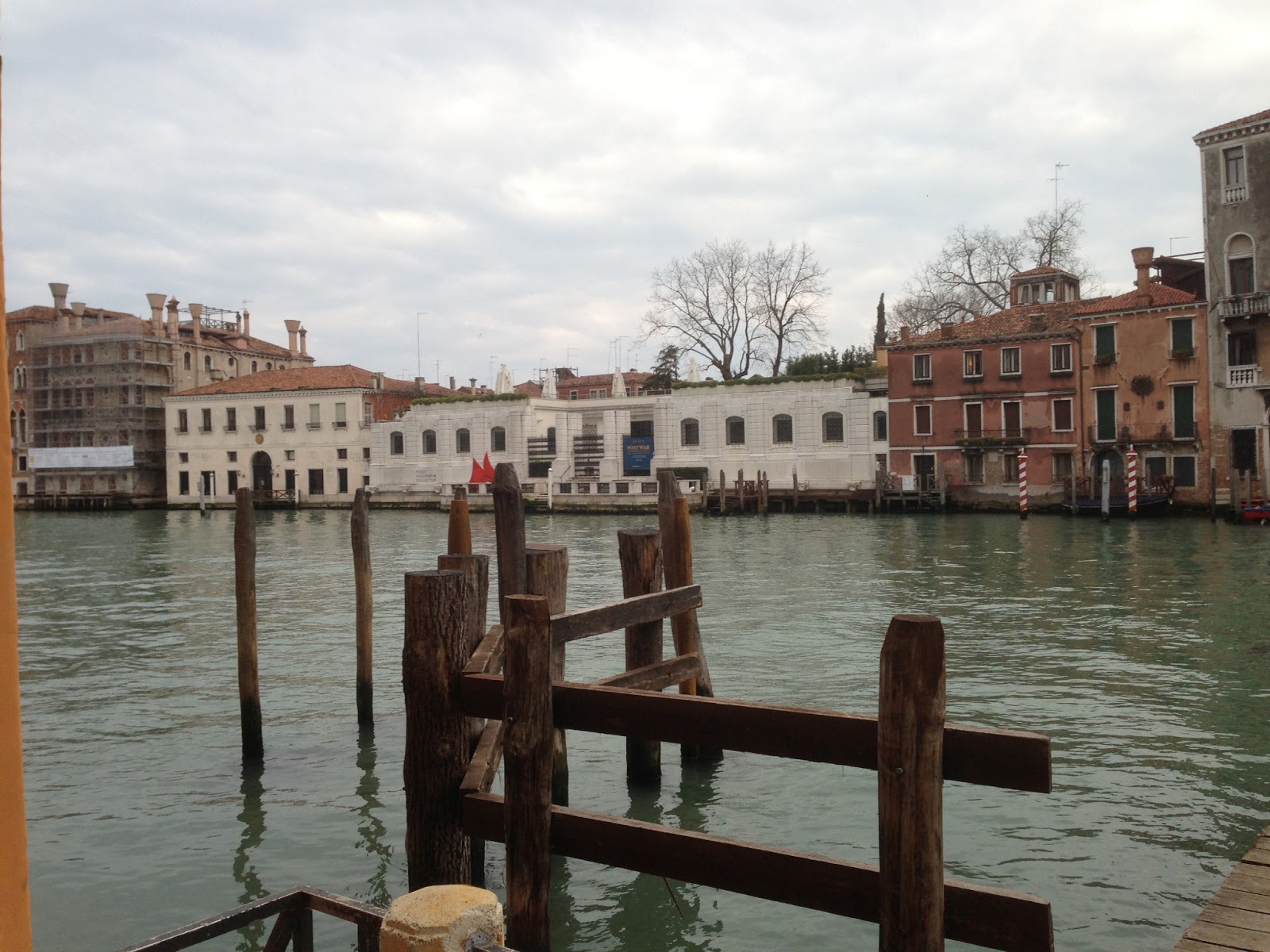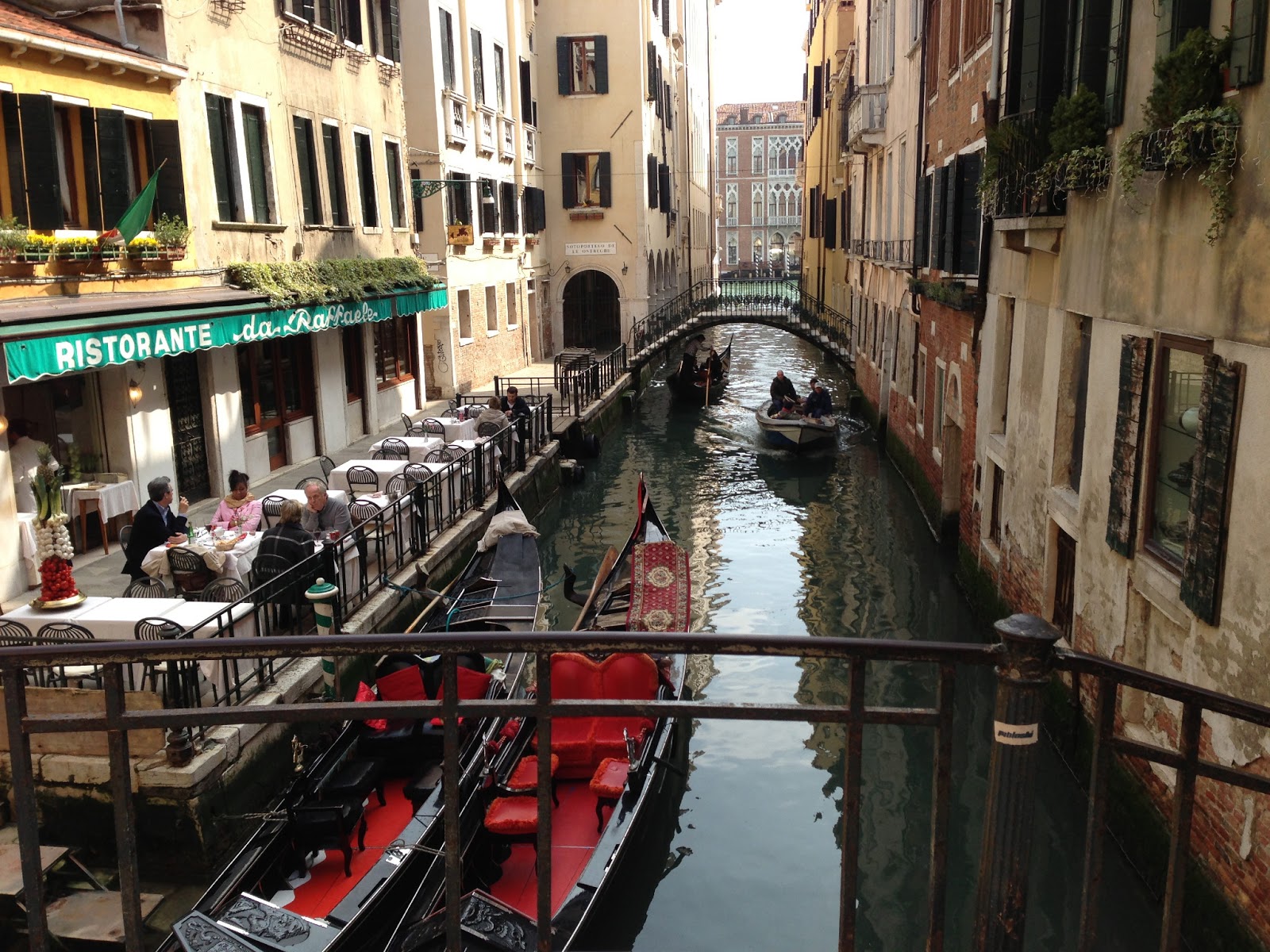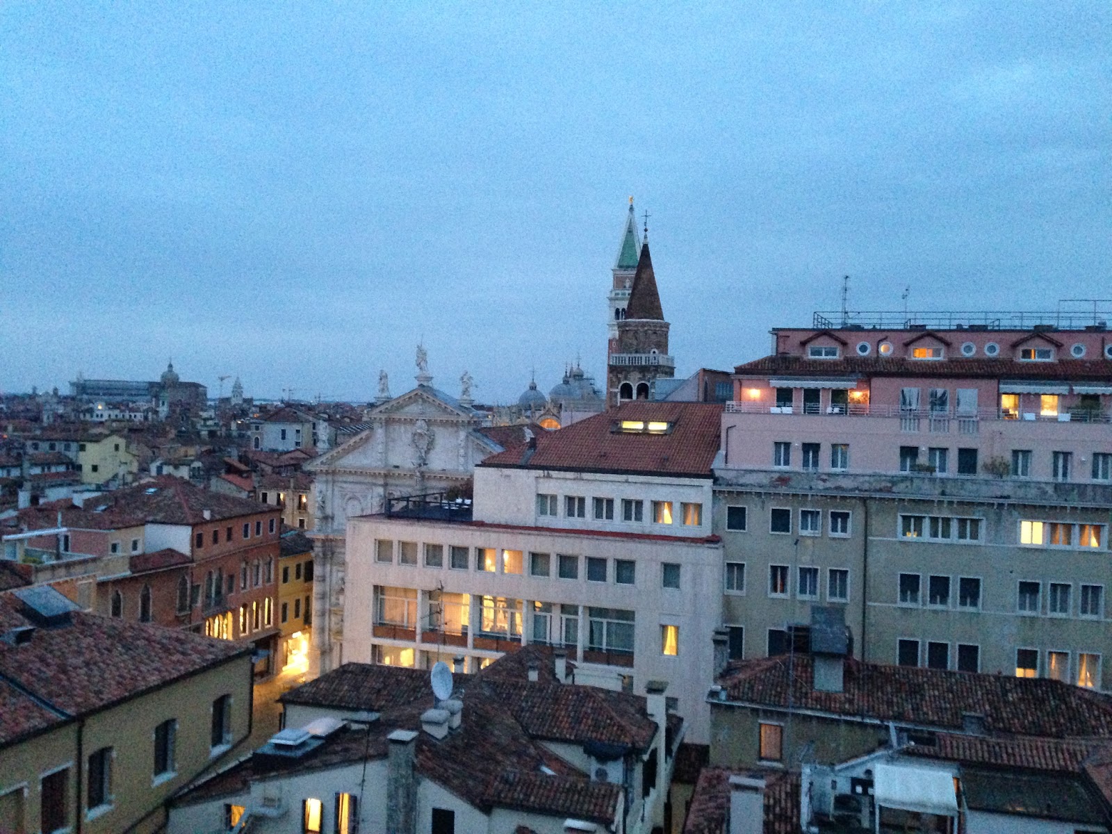 I'm now happily settled into an equally rated but far nicer hotel, one in which I was able to bargain for an amazing room at quite a reduced (though still rather high; this is a luxury tour) room. The room includes an amazing terrace that wraps around two sides of it. Here's a shot of the Grand Canal in the distance.