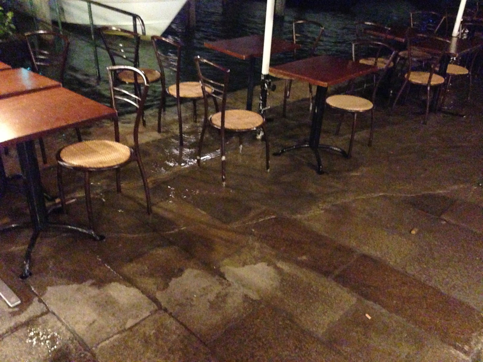 On the way back to the hotel, high tide was hitting its peak and leaving water all over the city, as here, around chairs that had, only two hours earlier, sat on dry ground.