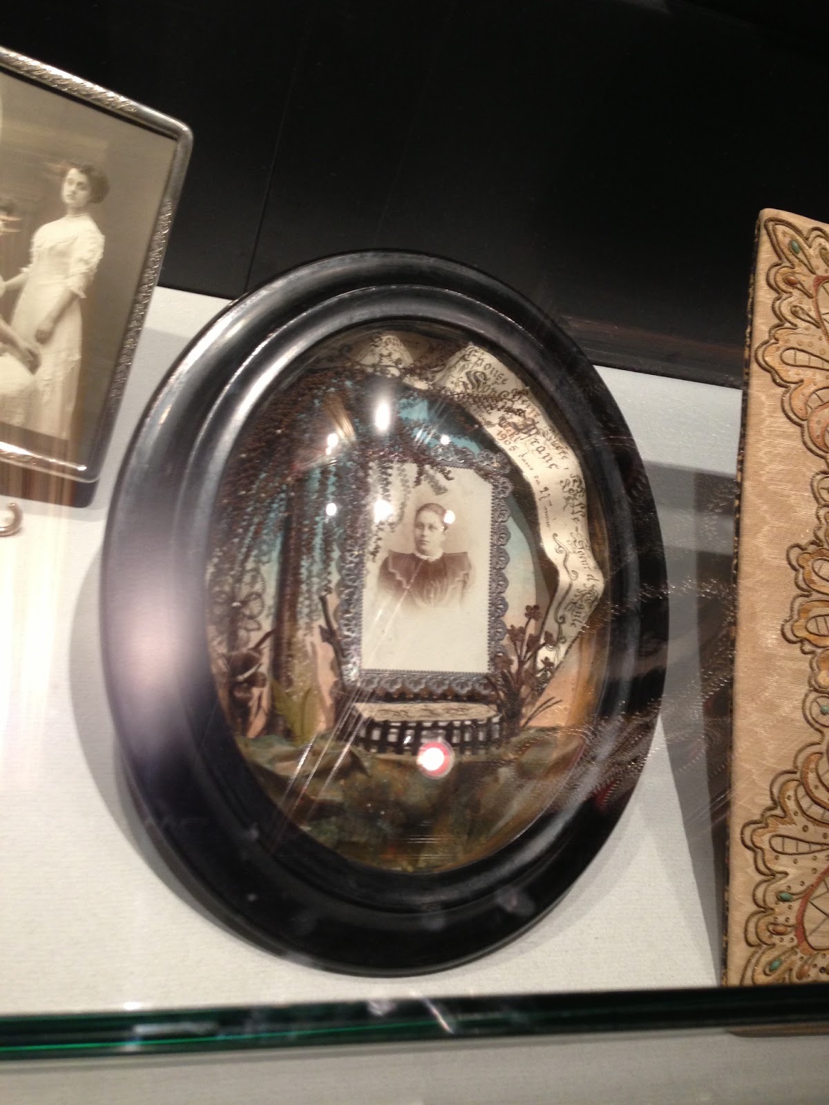 The other small rooms focused on everything from the origins of photography, to early cameras, to negatives, to photo albums, and, finally, to objects built from or around photos. I don't believe the museum allowed photography, but I once again broke the rules one time to capture this intricate memento mori piece.