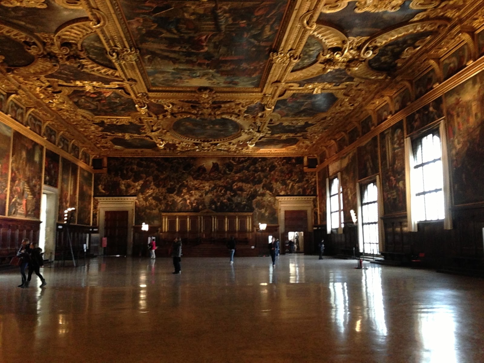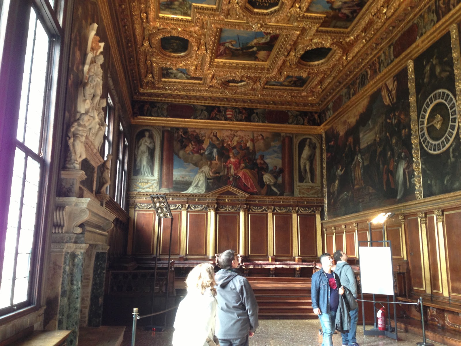 The progressively more luxurious halls that would ultimately take you to the various governing bodies are amazing, rooms crowded with wonderful paintings by Veronese and Tintoretto, among others. They did not permit photography, so I tried to minimize the number of shots I took; most visitors didn't even bother. Here's a sense of one of the rooms.